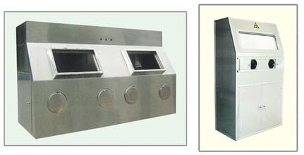 1、放射性同位素源分裝裝置,由箱體、機械手、抓取放射源瓶及開瓶蓋機構(gòu)、放射性同位素源分裝機構(gòu),照明及排氣機構(gòu)組成,其特征在于:a、機械手由弧形鉗口、彈簧、拉線、控制桿組成,在箱體的內(nèi)壁上固定有一層不銹鋼薄板,在箱體后壁正中偏上處設有機械千,機械手通過球體與箱體相連接,機械手前端安裝有兩個弧形鉗口,鉗口根部安裝有彈簧,鉗口的根部與拉線相連,拉線的另一端與控制桿相連;b、抓取放射源瓶及開瓶蓋機構(gòu)由吊架、齒輪、齒條、軸、操作手輪、卡頭組成,吊架上裝有齒輪與齒條,齒輪與齒條嚙合,齒輪裝在軸上,軸兩端裝有扭簧,并通過聯(lián)接軸與箱體外面的操作手輪相連,軸與裝扭簧的固定盒都固定在吊架上,齒條內(nèi)孔固定有電機,減速器通過聯(lián)軸節(jié)、軸承與輸出軸連接,壓蓋將齒條下端密封,卡頭通過螺釘與輸出軸活動連接,吊架由螺栓固定在箱體上;c:放射性同位素源分裝機構(gòu)由分裝罐,球形閥門、計量指示器、觀察鏡、釋放器組成,分裝罐由內(nèi)外兩層不銹鋼筒做成,夾層由鉛充實,分裝罐的下端裝有球形閥門,并引出箱體的外面與手柄相連,分裝罐內(nèi)設浮子,通過引線引出箱體外經(jīng)兩滑輪與計量指示器相連,計量指示器的下端連接有重錘,箱體的右側(cè)設有裝源觀察鏡,觀察鏡內(nèi)設互成45度角的兩片鏡片,在觀察鏡上片的背后固定有屏蔽鉛板,箱體右側(cè)下部設有釋放器及固定裝置,井通過球體固定在箱休上。